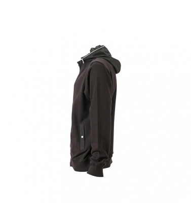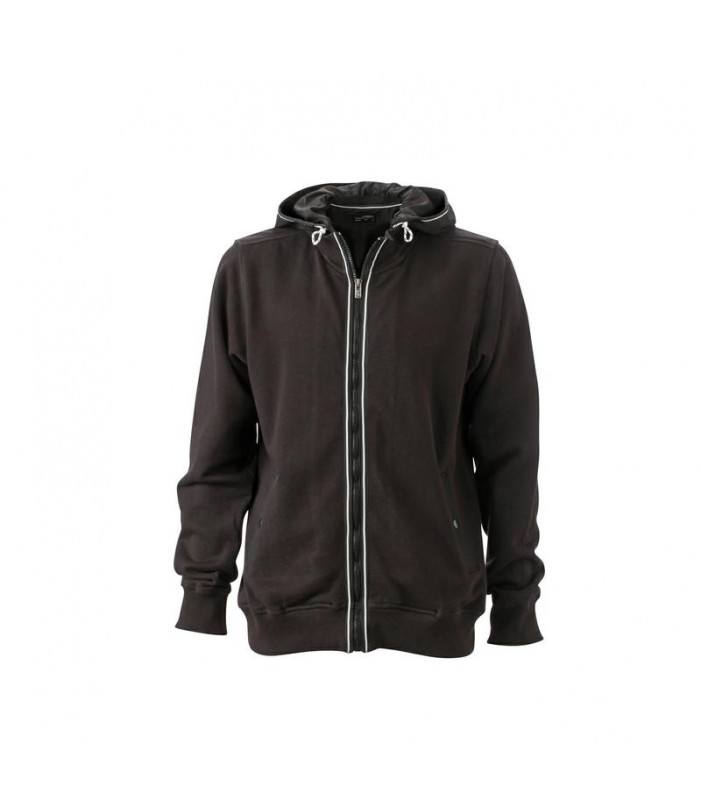 100% cotone. giacca in felpa con cappuccio removibile (con cerniera). bordini e colletto alla coreana in elastane, due tasche laterali con bottone automatico, fascetta in colore contrastante sulla chiusura lampo e sul cappuccio.