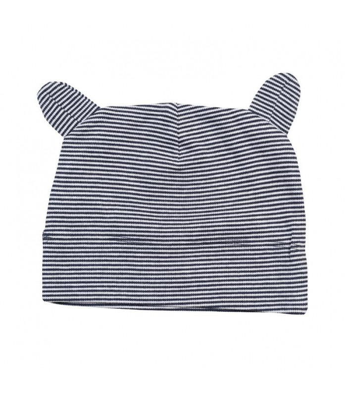 100% cotone organico ocs. cappellino baby con fantasia a strisce sottili, ampia fascia per un maggior comfort, due orecchie, tessuto morbido ed elasticizzato, etichetta a strappo. col. wh/hgm 92% cot. 8% vis.