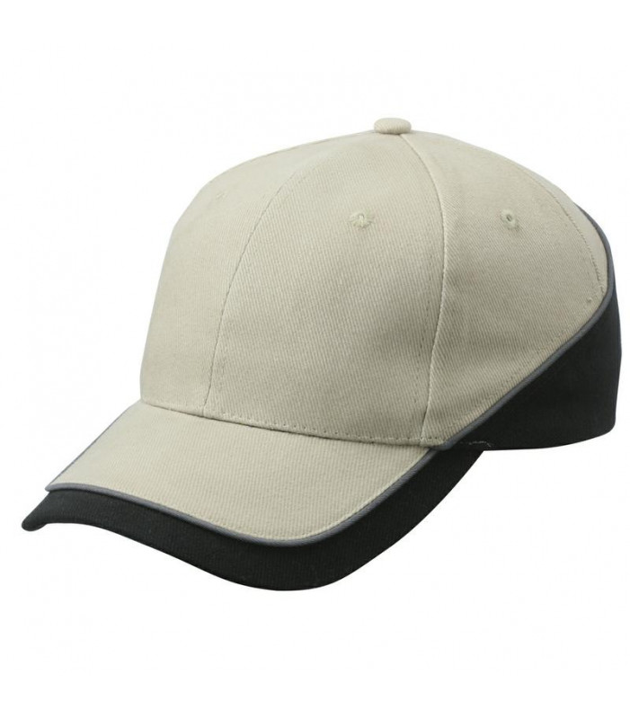 cappello 6 pannelli di altissima qualitã 6 fori di aerazione ricamati, ricchi inserti a contrasto e cordoncino attorno al cappello, pannello frontale laminato, fascetta tergisudore in satin . chiusura a clip con occhiello metallico, cotone molto pesante pettinato