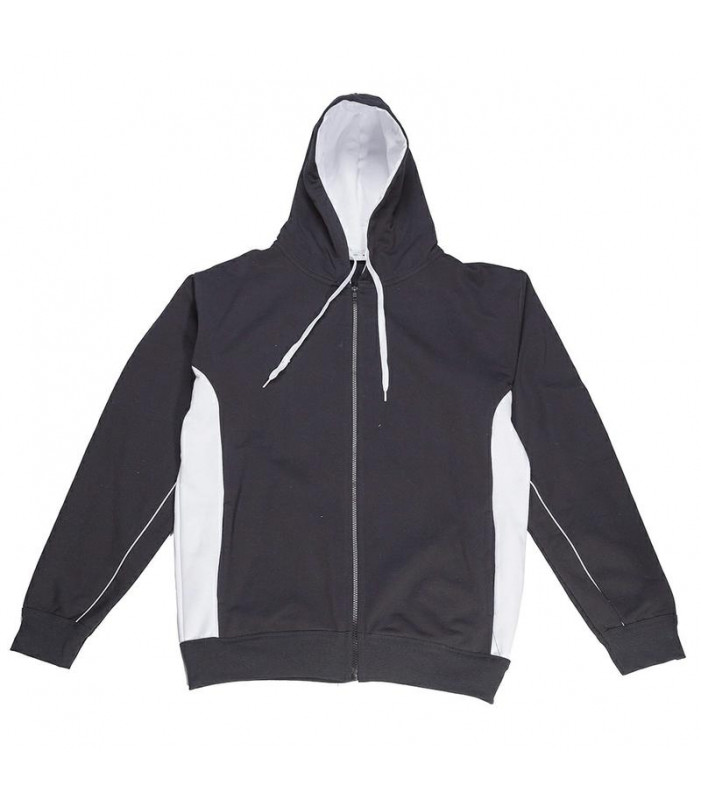 100% cotone. felpa con maniche set-in, zip intera, parte interna del cappuccio, cordoncino, fianchi e cucitura nel braccio di colore contrastante, tasche laterali, struttura con cuciture laterali, felpata internamente.