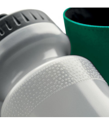 600d poliestere. porta borraccia e borraccia in plastica bpa-free inclusa, tappo estraibile morbido a vite, collo ergonomico che facilita la presa, apertura della bottiglia a collo largo per facilitare il riempimento e la pulizia, passante per cintura e m