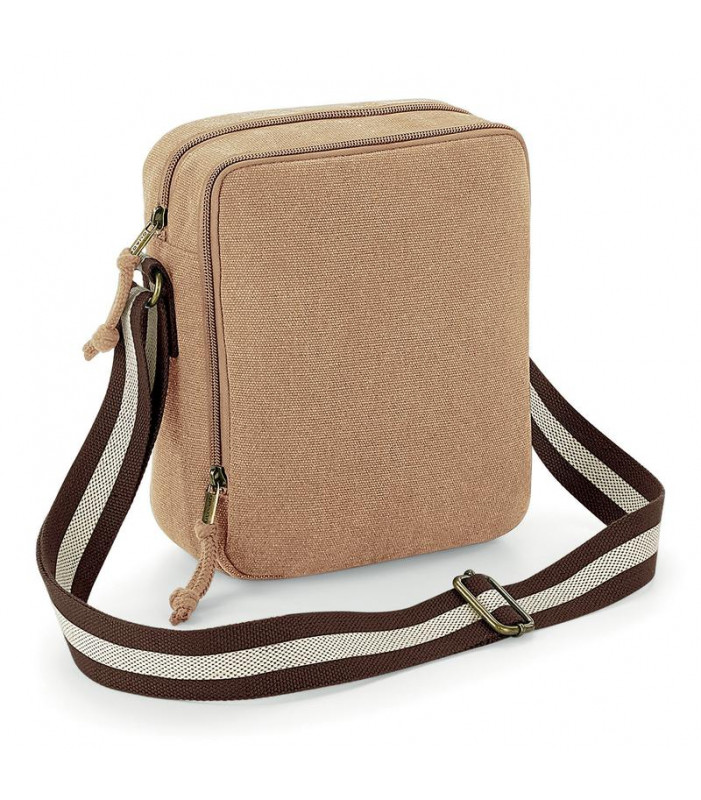 100% cotone canvas lavato. mini borsa a tracolla con scomparto principale con chiusura a zip, cinturino bicolore, tracolla regolabile, etichetta a strappo. dimensioni: 22.5x18.5x9 cm, capacitã : 3.5 litri, area stamapabile: 15x15 cm.