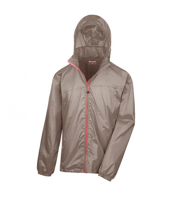 100% nylon, antivento, traspirante e impermeabile, zip frontale intera a contrasto, polsini elasticizzati, cappuccio a scomparsa, 2 tasche laterali di cui una con chiusura a zip.