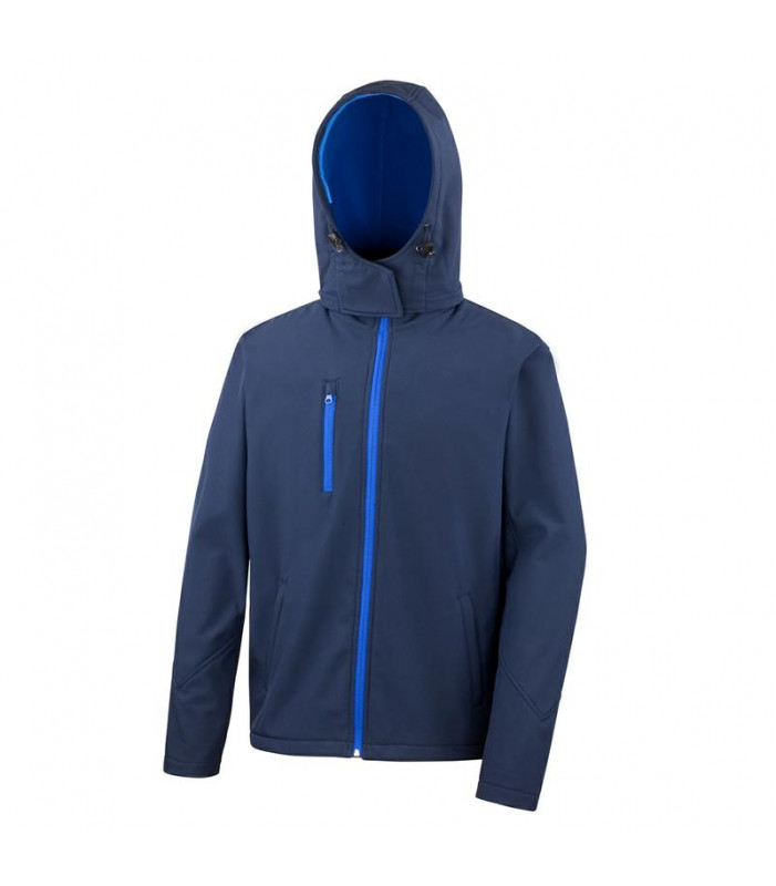93% poliestere, 7% elastane, giacca softshell anti-vento, traspirante e impermeabile, tessuto interno in caldo micropile, cappuccio regolabile e rimovibile, zip frontale intera e 1 tasca lato cuore con zip, sprone sul retro decorativo, etichetta neutra. g