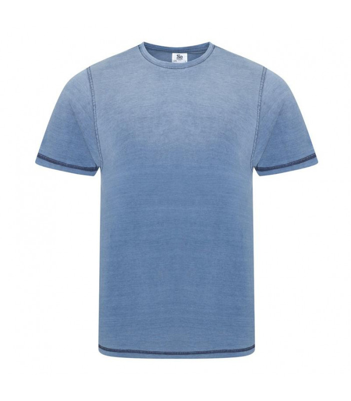 100% cotone. t-shirt uomo single jersey, fashion fit, maniche corte, colletto a costine, cuciture laterali. cuciture a contrasto su orlo e maniche. disponibile in 2 lavaggi di blu differenti, entrambi con effetto graduazione.