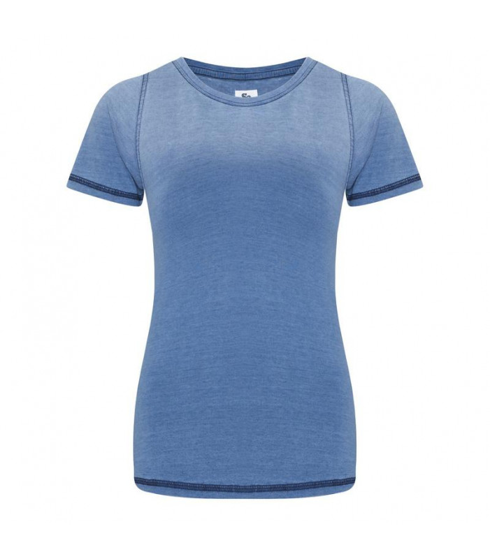 100% cotone, t-shirt donna single jersey, fashion fit, maniche corte, colletto a costine, cuciture laterali. cuciture a contrasto su orlo e maniche. disponibile in 2 lavaggi di blu differenti, entrambi con effetto graduazione.