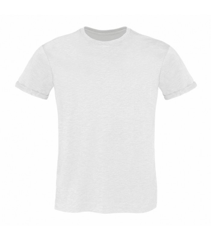 100% cotone ring spun, single jersey con filato slub. risvolto nelle maniche fermato con cucitura in 4 punti, cuciture laterali. 150 g/m²