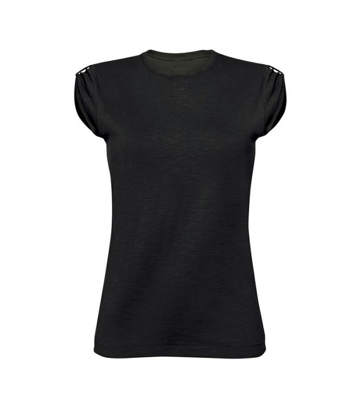 100% cotone ring spun, single jersey con filato slub. taglio femminile, manica raccolta sulla spalla, cuciture laterali. 150 g/m²