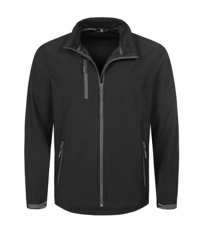 94% poliestere, 6% elastane. soft shell con cerniere con tiretto in plastica, fori di ventilazione in metallo sotto le maniche (senza nichel), nastro di rinforzo, tasche laterali e tasca sul petto con cerniera, membrana tpu antivento e idrorepellente, bor