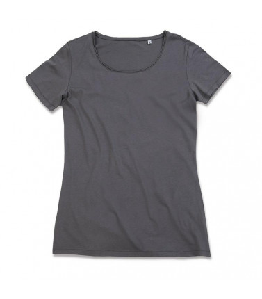 100% cotone filato ad anelli pettinato. t-shirt da donna, collo moderno e largo, collo rollino nello stesso tessuto della t-shirt, cuciture doppie in vita e sul bordo delle maniche, nastro di rinforzo, piccola etichetta della taglia sul collo, etichetta d