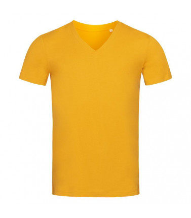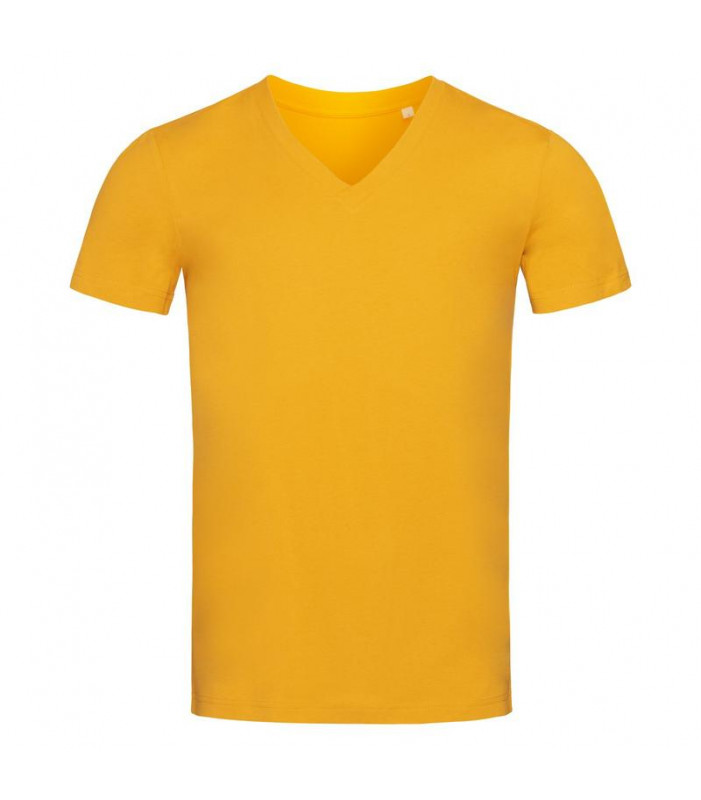 t-shirt maniche corte scollo a v 100% cotone filato ad anelli pettinato organico certificato ocs. cuciture laterali, nastro di rinforzo da spalla a spalla. scollatura a v sovrapposta, con bordo a costine orlato con elastan. nessuna etichetta o stampa nel