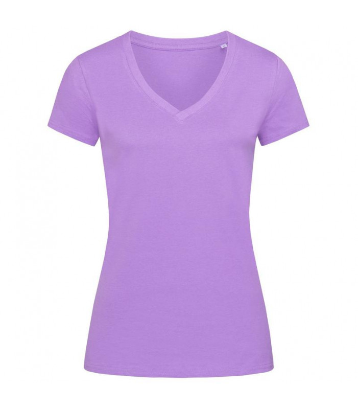 t-shirt scollo a v maniche corte, 100% cotone filato ad anelli pettinato organico certificato ocs. cuciture laterali, nastro di rinforzo da spalla a spalla. scollatura a v sovrapposta ampia e moderna, con bordo a costine orlato con elastan. nessuna etiche