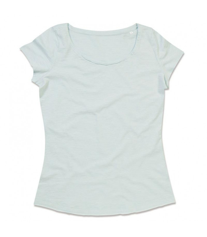 t-shirt maniche corte 100% cotone ring-spun, filato slub. girocollo ampio e orlo taglio vivo a costine piccole, cuciture a catena decorative, cuciture laterali. 140 g/m2. l'etichetta del marchio è separata da quella della composizione e quindi facilmente