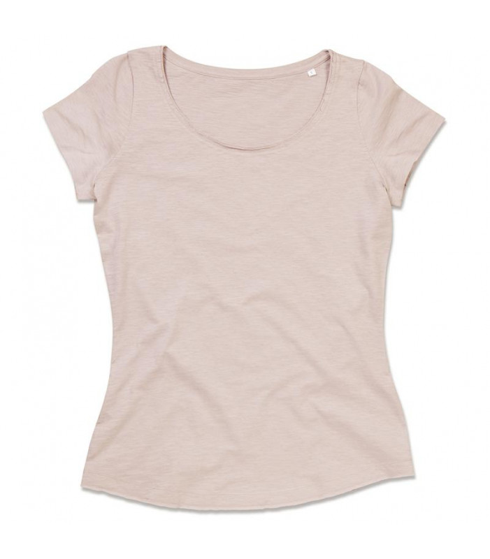 t-shirt maniche corte 100% cotone ring-spun, filato slub. girocollo ampio e orlo taglio vivo a costine piccole, cuciture a catena decorative, cuciture laterali. 140 g/m2. l'etichetta del marchio è separata da quella della composizione e quindi facilmente