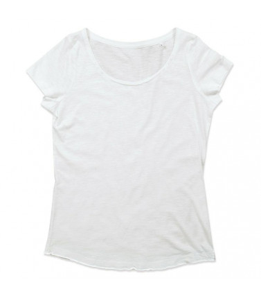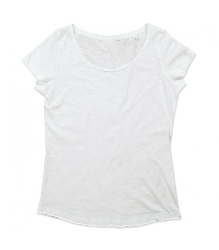 t-shirt maniche corte 100% cotone ring-spun, filato slub. girocollo ampio e orlo taglio vivo a costine piccole, cuciture a catena decorative, cuciture laterali. 140 g/m2. l'etichetta del marchio è separata da quella della composizione e quindi facilmente