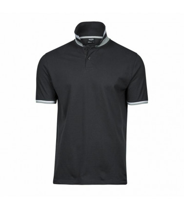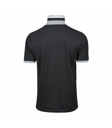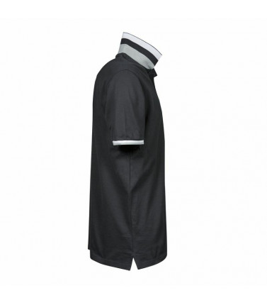 100% cotone pique pettinato ringspun. polo con strisce a contrasto su costina di collo e maniche, 4 bottoni tono su tono, cuciture doppie su giromanica e orlo inferiore, nasto di rinforzo da spalla a spalla, spacchetti laterali con nastrino in contrasto,