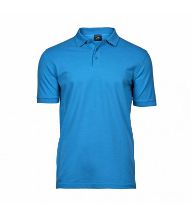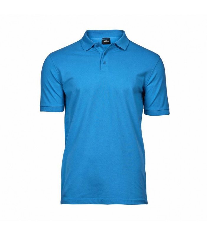 polo luxury stretch uomo, 215 g/m², 95% cotone ring-spun, 5% elastan, tessuto mini pique, doppio prelavaggio, colletto a costine lycra, fettuccia al collo, abbottonatura con rifinitura accurata, taglio attillato