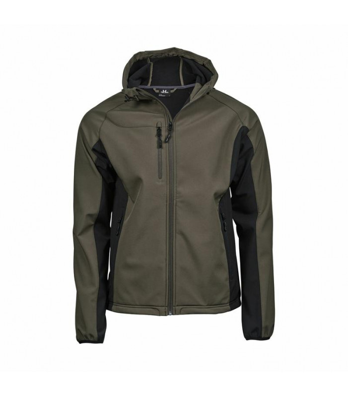 95% poliestere, 5% spandex, membrana tpu. giacca in softshell con cappuccio di 2 tonalitã differenti, 2 tasche frontali capienti, polsini elasticizzati, taschino al petto.
