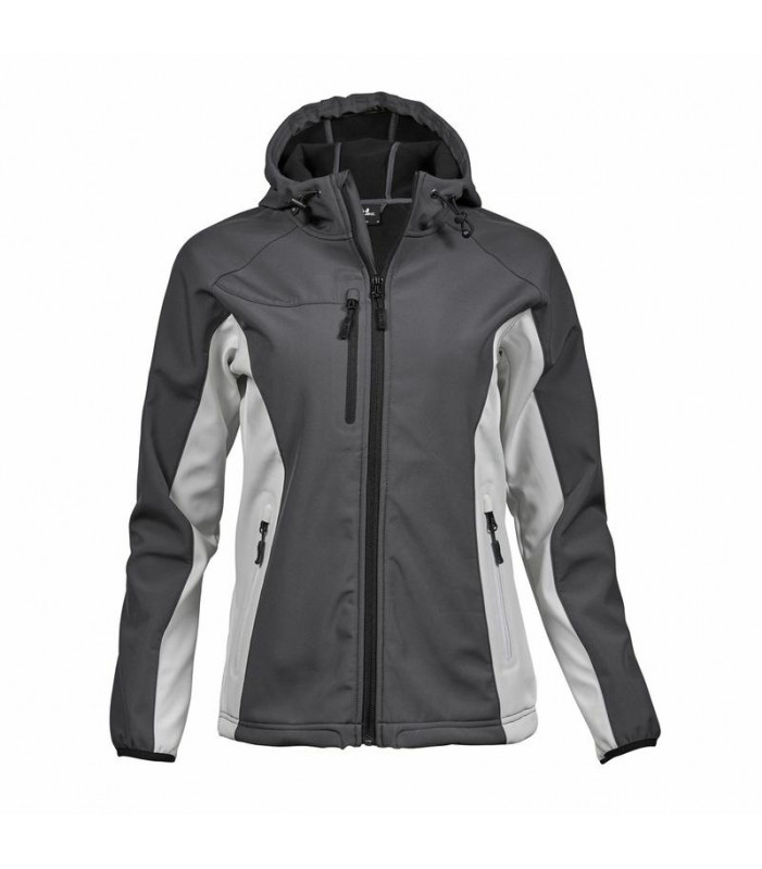 95% poliestere, 5% spandex, membrana tpu. giacca in softshell con cappuccio di 2 tonalitã differenti, 2 tasche frontali capienti, polsini elasticizzati, taschino al petto.