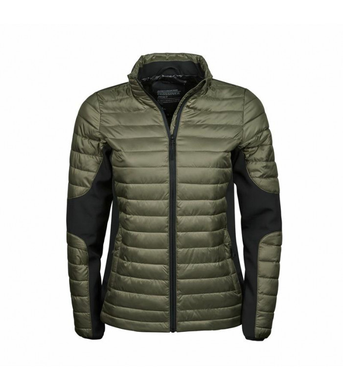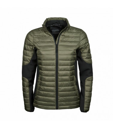 100% poliestere 300t, inserti in softshell 95% poliestere e 5% elastane, imbottitura in poliestere. giacca sportiva urban look, 2 ampie tasche frontali, tasca interna, cerniere cmz, polsino elastico, predisposta per il ricamo, vestibilità femminile.