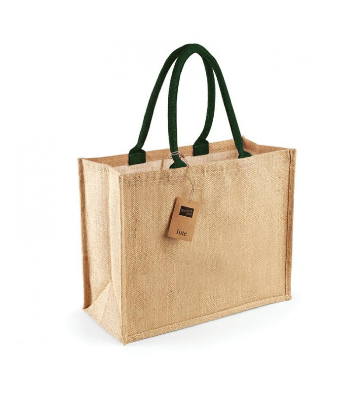 100% juta. dimensioni bxhxp: 33x42x19 cm, capacità 21 litri, area stampabile bxh: 24x34 cm massimo. manici di cotone robusto con colori a contrasto.