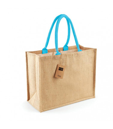 100% juta. dimensioni bxhxp: 33x42x19 cm, capacità 21 litri, area stampabile bxh: 24x34 cm massimo. manici di cotone robusto con colori a contrasto.