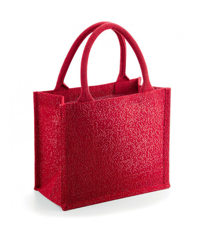 98% iuta laminata 2% fibra metallizzata 149gr manici in cotone particolare in filo brillante color oro dimensioni: 26 x 22 x 14 cm capacità: 6 litri lunghezza del manico: 35 cm pulire con una spugna