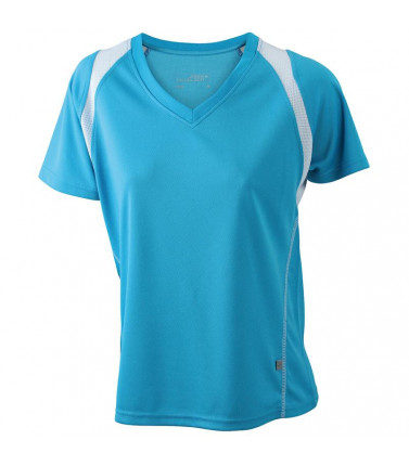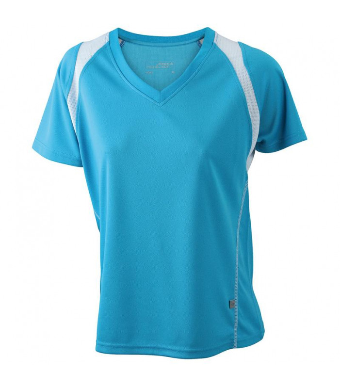 t-shirt collo a v 100% poliestere traspirante. tessuto leggero e comodo, regola lumidità, ad asciugatura rapida. cuciture piatte, bordini e transfer riflettenti. leggermente sciancrata.