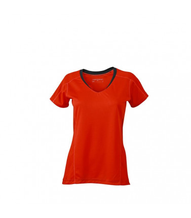 t-shirt collo a v in 100% poliestere traspirante. regola lumidità, asciuga rapidamente. inserti e cuciture flatlock in colore a contrasto, disegno riflettente sul retro, leggermente avvitata.