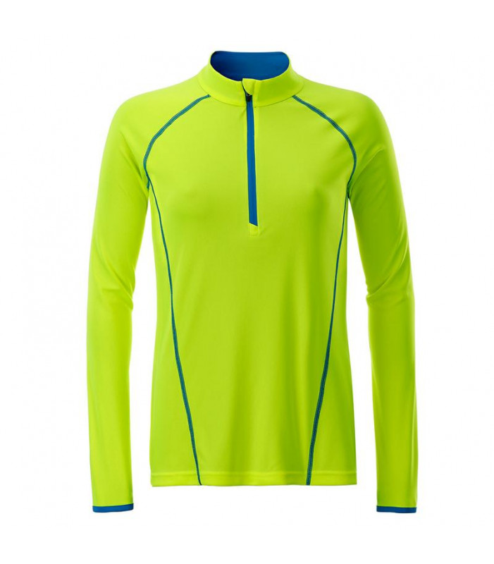 t shirt manica lunga per fitness e sport transpirante e con regolazione umiditã . asciugatura rapida, leggera e confortevole. maniche raglan, collo alto. cuciture in contrasto sul davanti e sul retro, zip con protezione per il mento, leggermente avvitata tessuto esterno (130 g/mâ²): 100% poliestere, donna, manica lunga, policromo