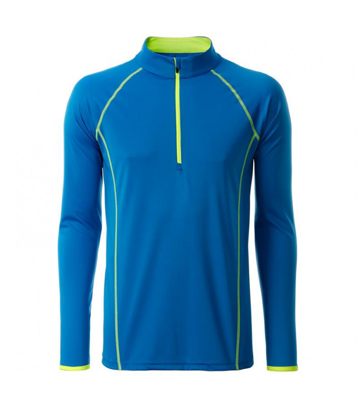 t shirt manica lunga per fitness e sport transpirante e con regolazione umiditã . asciugatura rapida, leggera e confortevole. maniche raglan, collo alto. cuciture in contrasto sul davanti e sul retro. zip con protezione per il mento. tessuto esterno (130 g/mâ²): 100% poliestere, manica lunga, policromo
