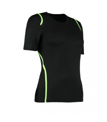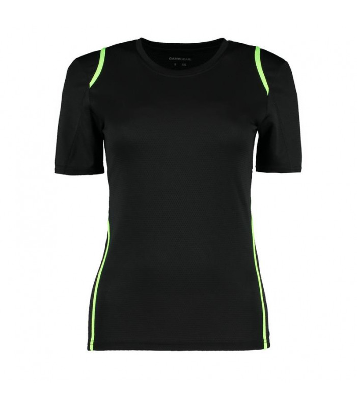 100% poliestere traspirante, girocollo con fettuccia interna, sottili inserti in contrasto su spalle, schiena e fianchi. sagomata con cuciture laterali.