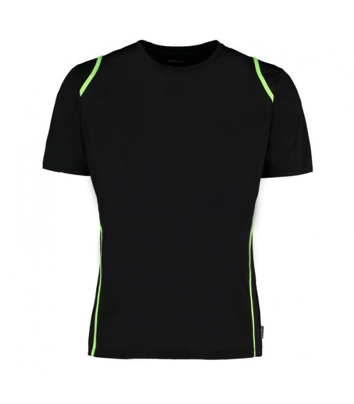 100% poliestere traspirante, girocollo con fettuccia interna, sottili inserti in contrasto su spalle, schiena e fianchi. cuciture laterali.